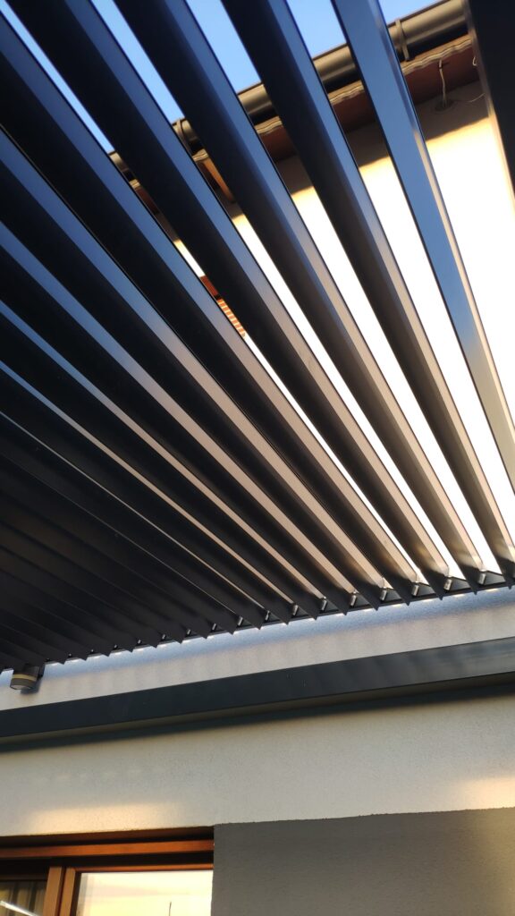 Dach pergoli został wyposażony w obrotowe lamele, co umożliwia regulację stopnia nasłonecznienia i przepływu powietrza. Lamele wykonane są z trwałych materiałów, takich jak aluminium co sprawia, że są odporne na warunki atmosferyczne i łatwe w utrzymaniu czystości.